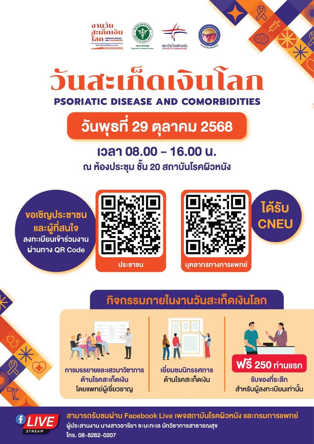 สถาบันโรคผิวหนังขอเรียนเชิญบุคลากรทางการแพทย์ ผู้ป่วย และประชาชนผู้สนใจทุกท่าน เข้าร่วมงานวันสะเก็ดเงินโลกประจำปี 2568 เพื่อเสริมสร้างความรู้ความเข้าใจเกี่ยวกับโรคสะเก็ดเงินให้กว้างขวางยิ่งขึ้น