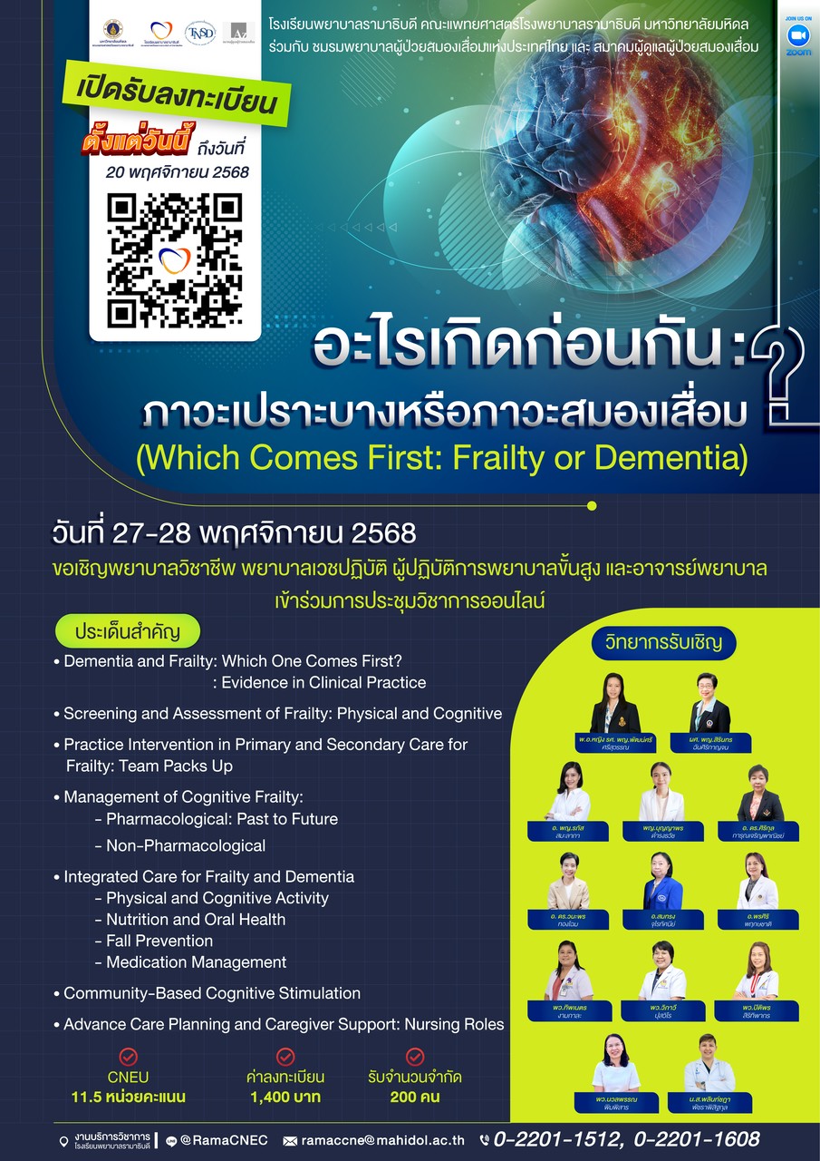 เรียนเชิญผู้สนใจเข้าร่วมการประชุมวิชาการออนไลน์หัวข้อ "อะไรเกิดก่อนกัน: ภาวะเปราะบางหรือภาวะสมองเสื่อม?" (Which Comes First: Frailty or Dementia) จัดโดยโรงเรียนพยาบาลรามาธิบดี, ชมรมพยาบาลผู้ป่วยสมองเสื่อมแห่งประเทศไทย และสมาคมผู้ดูแลผู้ป่วยสมองเสื่อม เพื่อร่วมหาคำตอบในประเด็นสำคัญนี้ การประชุมจะจัดขึ้นในวันที่ 27-28 พฤศจิกายน 2568 ในรูปแบบออนไลน์ผ่านโปรแกรม ZOOM Workplace โดยมีค่าลงทะเบียน 1,400 บาท และรับจำนวนจำกัดเพียง 200 ท่าน ผู้เข้าร่วมจะได้รับหน่วยคะแนน CNEU 11.5 เพื่อพัฒนาความรู้ความเข้าใจอย่างลึกซึ้งในหัวข้อดังกล่าว