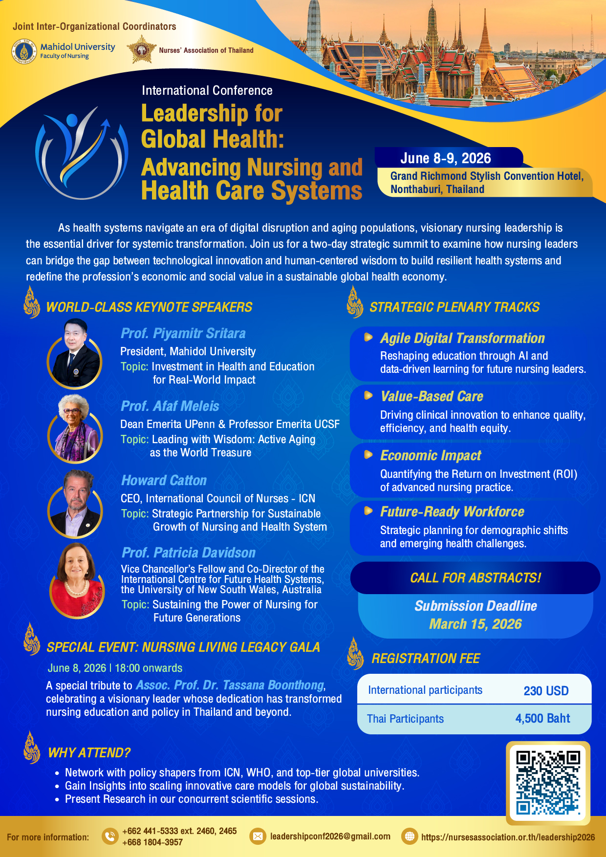 คณะแพทยศาสตร์ศิริราชพยาบาล และคณะพยาบาลศาสตร์ มหาวิทยาลัยมหิดล ร่วมกับ สมาคมพยาบาลแห่งประเทศไทย ในพระราชูปถัมภ์ฯ ขอประกาศเชิญชวนแพทย์ พยาบาลวิชาชีพ อาจารย์ นักวิจัย และบุคลากรสาธารณสุขทั่วประเทศ เข้าร่วมงานประชุมวิชาการระดับนานาชาติที่ยิ่งใหญ่ที่สุดแห่งปี เพื่อสร้างจุดเปลี่ยนสำคัญให้กับระบบสาธารณสุขไทยและโลก หัวข้อ “Leadership for Global Health: Advancing Nursing and Health Care Systems”วันที่ 8 – 9 มิถุนายน 2569 ณ Grand Richmond Stylish Convention Hotel จ.นนทบุรี