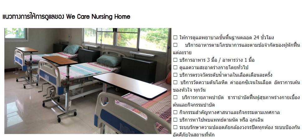 บริษัท วี เนิร์ซซิ่ง โฮม จำกัด( We Nursing Home) เนิร์ซซิ่งโฮม บริบาลและฟื้นฟู ผู้สูงอายุและผู้ป่วย ที่บุตรหลาน ไม่สะดวกที่จะดูแลท่านได้ เราให้การบริบาลผู้สูงอายุที่ช่วยเหลือตัวเองได้ และไม่ได้ ผู้ที่ต้องการพักฟื้นเพื่อฟื้นฟูหลังจากออกจากโรงพยาบาล ผู้ที่ต้องการทำกายภาพบำบัด ธาราบำบัด กิจกรรมบำบัด โดยนักกายภาพบำบัด ผู้ป่วยโรคเรื้อรัง ที่ต้องให้อาหารทางสายยาง เจาะคอ ดูดเสมหะ แผลกดทับ โรคมะเร็ง โรคหัวใจ โรคหลอดเลือดในสมอง โรคไต อัลไซเมอร์ สมองเสื่อม พาร์กินสัน เราดูแลทั้งด้านร่างกาย และจิตใจ แบบองค์กรโดยรวม จากเจ้าหน้าที่และทีมงานที่มีประสบการณ์ มากว่า 20 ปี ”