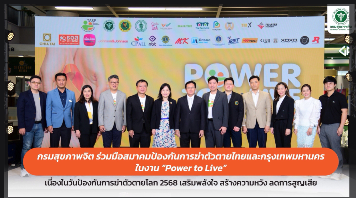 กรมสุขภาพจิต ร่วมมือสมาคมป้องกันการฆ่าตัวตายไทยและกรุงเทพมหานครในงาน “Power to Live” เนื่องในวัน ป้องกันการฆ่าตัวตายโลก 2568 เสริมพลังใจ สร้างความหวัง ลดการสูญเสีย